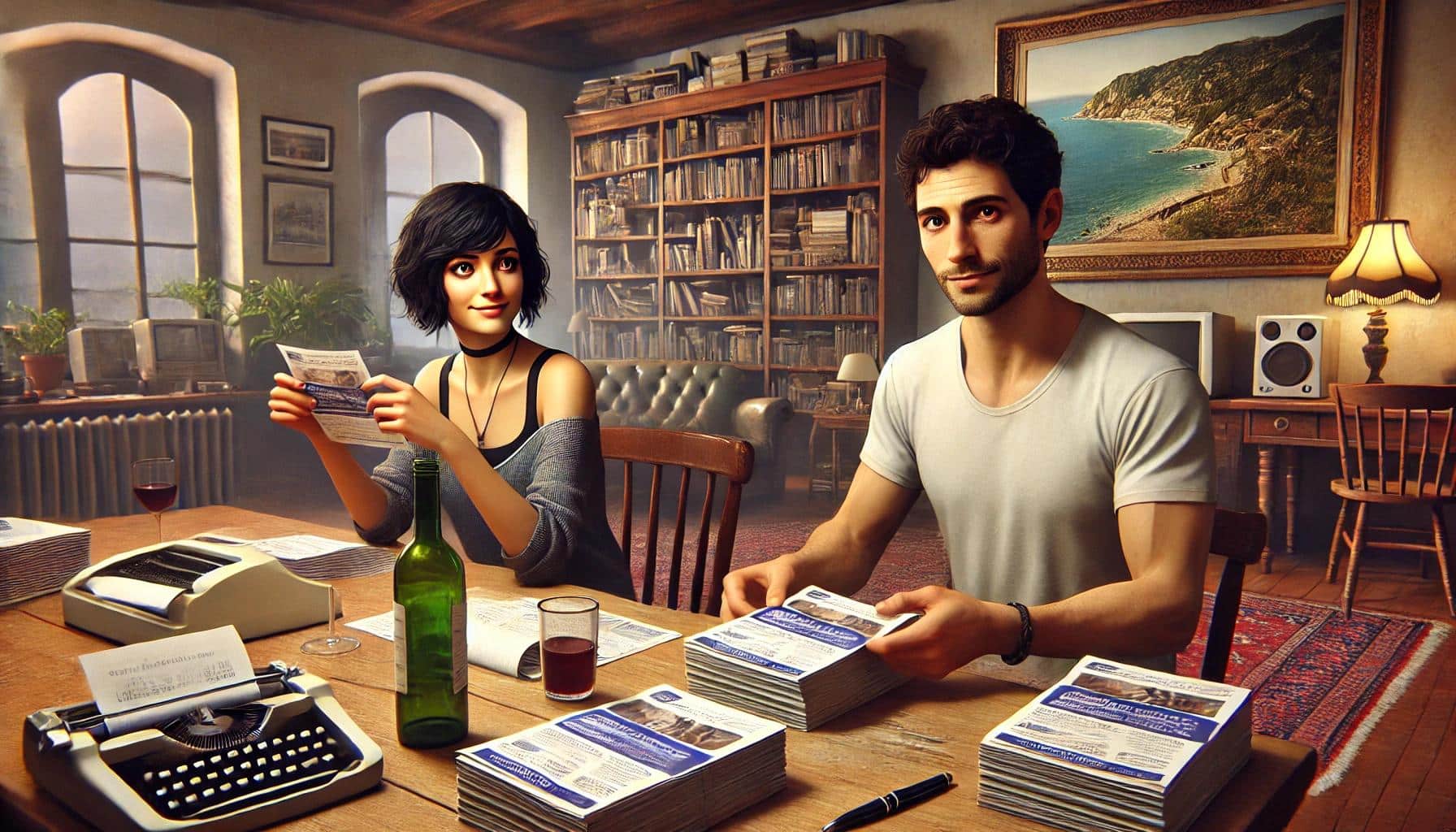 Eine ruhige Jazzmelodie spielte im Hintergrund. In der Mitte des Raumes stand ein Tisch mit einem großen Stapel frisch gedruckter Flyer, es waren die Flyer, die Dimi und Elli heute falten wollten.