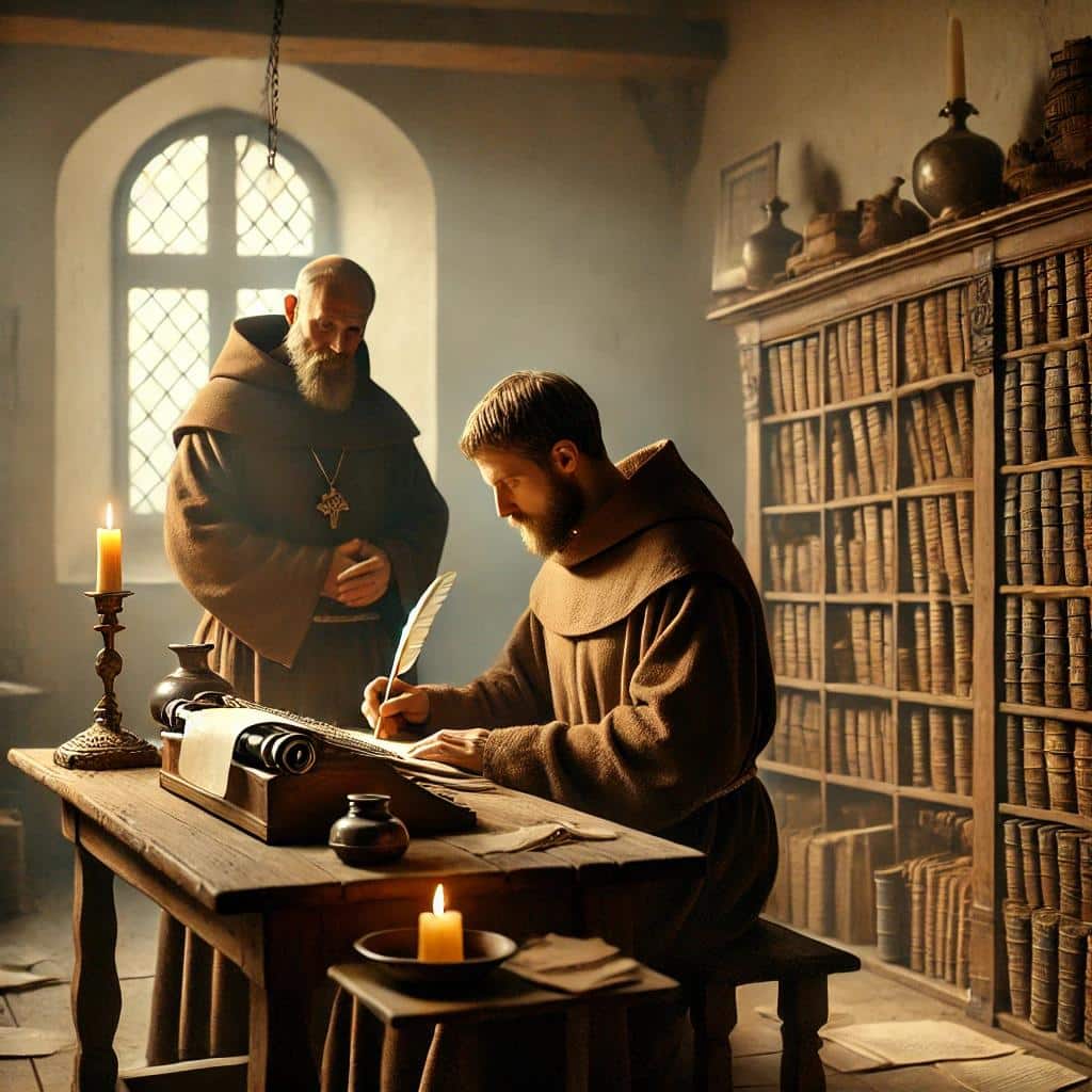 Die Tür zur Schreibstube öffnete sich, und Bruder Johannes trat leise ein, seine neugierigen Augen glitten über die Regale mit den alten Schriften. „Bruder Lukas, was schreibst du dort?“ Seine Stimme war gedämpft, als wolle er die heilige Atmosphäre des Raumes nicht stören.